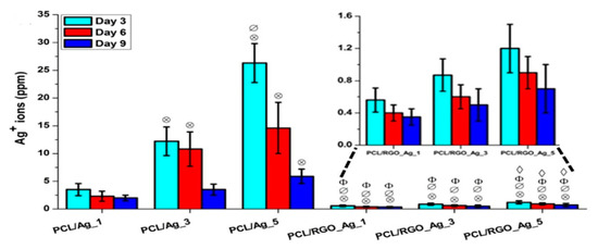 Very recently, Tjong and coworkers studied antibacterial activity of electrospun PLA/1 wt% GO-AgNPs, PLA/GO and PLA/AgNPs fibrous mats [165]. The electrospinning solutions were prepared by dissolving PLA in mixed DMF and DCM solvents followed by either adding GO, AgNPs or hybrid GO-AgNPs. Figure 11a–d show the SEM images depicting the morphologies of neat PLA, PLA/1 wt% GO, PLA/3 wt% AgNPs, and PLA/1 wt% GO–3 wt% AgNPs nanofibers. Pure PLA mat exhibits smooth and continuous fibers without forming polymer beads. PLA fibers have an average fiber diameter of 751 ± 103 nm on the basis of ImageJ software analysis (inset figure). The fiber diameters of nanocomposite fibrous mats decrease markedly by adding 1 wt% GO or AgNPs of different loading levels. By incorporating hybrid 1 wt% GO-AgNPs into PLA, fined fibers with the smallest diameters are produced. As recognized, the fiber diameter and porosity level of electrospun scaffolds can be tuned by monitoring the solution parameters including solvent type, polymer concentration, viscosity, solution conductivity, and operational factors such as the applied voltage, syringe needle diameter, and syringe needle tip to collector distance [150,166]. The additions of non-conducting fillers increase the viscosity of polymer solution, so high viscosity results in a large fiber diameter. However, conducting fillers tend to increase the solution conductivity, thereby allowing greater stretching of the fluid jet due to the presence of more charge carriers. This leads to the formation of fine composite fibers. In this respect, PLA/AgNPs and PLA/1 wt% GO-AgNPs mats exhibit smaller diameters than neat PLA mat. Figure 12a shows the water contact angle images and values for both PLA/AgNPs and PLA/1 wt% GO-AgNPs systems. The water contact angle of PLA/AgNPs system decreases with increasing AgNPs content, thereby improving the wettability of the system. The additions of AgNPs to hydrophobic polymers have been found to improve their wettability by reducing their water contact angles [167]. Similarly, GO with abundant oxygenated groups also improves the wettability of polymers. As such, PLA/AgNPs mats with high AgNPs loadings and PLA/1 wt% GO-AgNPs system exhibit less hydrophobic surfaces (Figure 12a). Therefore, PLA/7 wt% AgNPs, PLA/1 wt%GO-3 wt% AgNPs and PLA/1 wt%GO-7 wt% AgNPs fibrous mats can release a large amount of Ag+ ions upon immersion in distilled water (Figure 12b). It is noted that electrospun PLA fibrous mats can release more silver ions than dense PLA nanocomposite films. This is because water molecules can penetrate into fibrous mats, and degrade the PLA matrix inside the mats to expose AgNPs for releasing Ag+ ions. In dense nanocomposite films, water molecules can degrade only the PLA matrix of nanocomposite surfaces for exposing AgNPs.