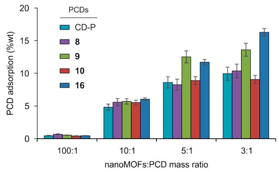 The amount of PCDs associated with the nanoMOFs was determined by direct quantification of the P content in the coated samples by ICP-MS after sample digestion, taking advantage of the fact that P is the only element present in the PCDs derivatives but not in the nanoMOFs. As it can be seen in Figure 2, the amount of PCDs attached to nanoMOFs was directly proportional to the amount of the coating material employed for the nanoMOFs coating procedure. In parallel, the grafting efficiencies of the various PCDs derivatives decreased from ~70 to ~35% with increasing the amount of PCDs in the preparation procedure (Supplementary Materials, Figure S26). In the case of CD-P and 8–10, the grafted amounts tended to reach a plateau when a 3:1 nanoMOFs:PCDs mass ratio was used. Thus, CD-P and derivative 8 decorated with seven mannose residues directly attached to its primary face reached a value of 10 ± 1 wt% of grafting, while PCD 10 coated the nanoMOFs in less extension (9 ± 1 wt%). In contrast, PCD 9 decorated with seven flexible and less bulky TEG chains was adsorbed onto the nanoMOF surface at 14 ± 1 wt%, suggesting that steric hindrance of the coating structure might correlate with the nanoMOFs covering density. However, PCD 16 having fourteen long PEG chains on the secondary face showed the highest covering value of the series (16 ± 1 wt% at a 3:1 nanoMOF:16 mass ratio). Nevertheless, the amounts of coating PCDs were in the same range of previously reported values for other PCDs derivatives on the same MIL-100(Fe) nanoMOFs (~17 wt%) [17].