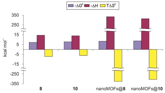 Thermodynamic profiles comprising free energy (−ΔG0), enthalpy (−ΔH), and entropy changes (TΔS0) for the interaction of conjugates 8, 10, nanoMOFs@8, and nanoMOFs@10 with ConA in 20 mM phosphate buffer (pH 7.2) at 25 °C for 8 and 10, and 10 mM TRIS buffer (pH 7.5) at 25 °C for nanoMOFs@8 and nanoMOFs@10.