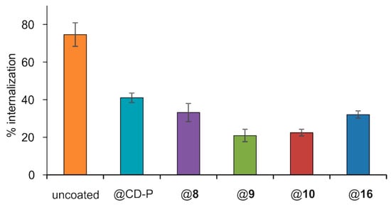 Once demonstrated by ITC that mannose-coated nanoMOFs recognized a specific protein receptor with enhanced avidity, we evaluated the interactions of nanoMOFs coated with 8–10 and 16 with macrophages on the murine macrophage cell line J774A.1. To compare the efficacy of different coatings, an incubation time of 4 h was chosen. Indeed, for uncoated MIL-100(Fe) nanoMOFs, this time corresponded to an efficient uptake by J774A.1 macrophages [64] as is in the order of magnitude of blood circulation times of PEG-coated nanoparticles [20]. Quantitative measurement on the amounts of nanoMOFs uptaken in cells were obtained by ICP-MS, after contact of nanoparticles with cells followed by extensive washing to remove the nonassociated particles. As shown in Figure 6, around 75% of uncoated nanoMOFs were taken up in macrophages after 4 h incubation, corresponding to around 23 µg nanoMOFs/3 × 105 cells. This result demonstrates that macrophages avidly take up nanoMOFs, in agreement with reported data [64]. Remarkably, the presence of PCDs 8–10 or 16 on the nanoparticles surface significantly reduced the nanoMOFs internalization. The nanoMOFs amounts uptaken by the cells decreased in the order CD-P > 8 > 16 > 10 > 9, with uptake percentages of 41 ± 3, 33 ± 5, 32 ± 2, 22 ± 2, and 21 ± 3%, respectively (Figure 6). These results indicated that all of the PCDs coatings played a role on the nanoMOFs cell internalization, although the relationship between the uptaking reduction and the structure is not obvious.