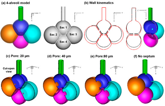 Models: (a) Four-alveolar model with septal walls communicated via interalveolar pores, (b) alveolar kinematics with rhythmically expanding (red) and contracting (black) walls. Different pore sizes were considered: (c) 20 µm, (d) 40 µm, (e) 100 µm, and (f) no septum.