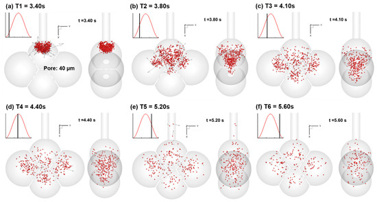 Snapshots of particle positions in the 40-µm-pore alveolar model during the first cycle at different instants: (a) T1 = 3.40 s, (b) T2 = 3.80 s, (c) T3 = 4.10 s, (d) T4 = 4.40 s, (e) T5 = 5.20 s, and (f) T6 = 5.60 s. Particles were 200 nm in diameter and were released 0.2 s (T0 = 3.20 s) from the second breathing cycle. The first cycle (0–3 s) was simulated to establish the transient airflow field. Due to particle Brownian motion and convection, some particles exited the geometry during exhalation.