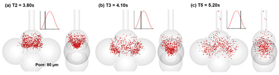 Snapshots of particle positions in the 80-µm-pore alveolar model during the first cycle at different instants: (a) T2 = 3.80 s, (b) T3 = 4.20 s, and (c) T5 = 5.20 s. In comparison to the snapshots of particle positions in Figure 5, a shorter distance of particle advancement was observed in the 80-µm-pore alveolar model at each corresponding instant in the 40-µm-pore alveolar model in Figure 5.