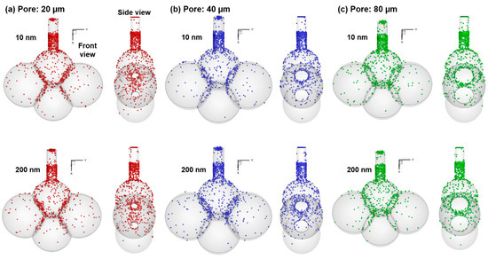 Of surface deposition for 10 nm (upper row) and 200 nm (lower row) particles in the alveolar models with a pore size of (a) 20 µm, (b) 40 nm, and (c) 80 nm.