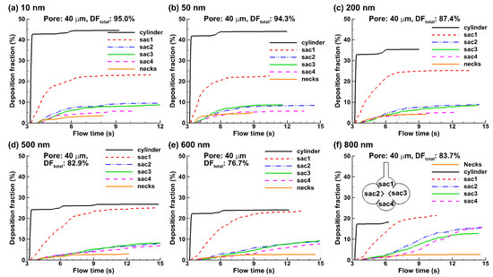 The temporal variation of the deposition fractions in different parts of the alveolar model are shown in Figure 9, which includes the duct, the four alveoli (Sac 1–4), and the necks that connect the alveoli. The high deposition rate in the duct is reflective of the importance of the diffusional screening, where the random motion of nanoparticles promotes significant deposition. This effect is most pronounced for ultrafine particles (10 and 50 nm in Figure 9a,b) that have higher diffusivities and diminishes with increasing particle sizes (200–800 nm in Figure 9c–f). Similar deposition fractions were observed between the two lateral alveoli (Sac 2 and Sac 3) for all cases considered because of their geometrical symmetry relative to the Sac 1, even though the deposition fraction varied with the particle size.