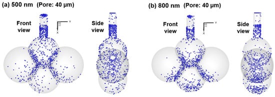 The surface deposition of large nanoparticles in the 40-µm-pore model is further visualized in Figure 10 for 500 nm and 800 nm aerosols. Compared to 10 nm and 200 nm aerosols in Figure 8b, particles of 500 nm and 800 nm are more concentrated at the bottom of each alveolus and close to the axial centerline, while at the same time, fewer particles deposit in the duct. This observation is even more pronounced for 800 nm aerosols than 500 nm aerosols. Moreover, a significantly higher fraction of 800 nm particles deposit in the bottom alveolus (Sac 4) than 500 nm particles due to increased gravitational effects, as also illustrated in Figure 9f vs. Figure 9d.