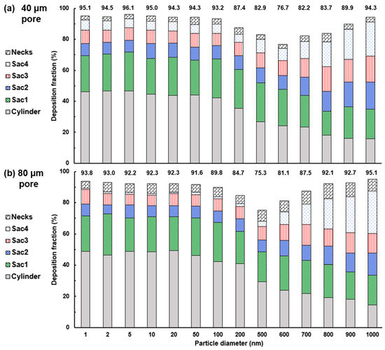 The final deposition fraction in the 40-nm-pore alveolar model as a function of particle sizes ranging from 1 nm to 1000 nm is shown in Figure 11a. The sub-regional deposition fractions (DF) in the six sections (duct, Sac 1–4, and neck) were plotted by stacking their DF values along the serial direction, the sum of which gave the total DF in the alveolar model. For comparison purposes, the corresponding plot in the 80-µm-pore alveolar model is presented in Figure 11b. It is noted that the DF is based on a bolus aerosol released into the geometry 0.2 s after the start of the second cycle, not a continuous inhalation.