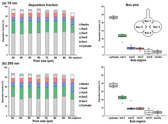 To further investigate the impact of the pore size on nanoparticle deposition, DFs in models with different pore sizes (20 µm to no septum) were plotted in Figure 12a,b for 10 nm and 200 nm, respectively. Considering the 200-nm aerosols, which is typical for inhalation nanomedicines, the pore size appears to exert an insignificant impact on both the total and sub-regional deposition fractions. A box plot that shows the DF variability caused by the pore size is also given on the right panel of Figure 12a,b. As noted before, the DF progressively decreases from the proximal to distal (i.e., from cylinder to Sac 4) no matter what the pore size is, corroborating the diffusional screening effects for both 10 nm and 200 nm aerosols. Among the six sub-regions considered, the variability is highest in the cylinder (duct) and Sac 4. The deposition in the duct is dominated by diffusion, while in the Sac 4 is more dictated by the gravitational sedimentation.