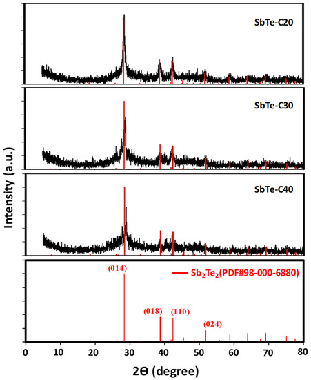 The XRD patterns of the SbTe-C20, SbTe-C30, and SbTe-C40 powders produced by HEMM are shown in Figure 1, which reveal that a pure hexagonal SbTe phase was formed in each case [34]. All of the diffraction peaks observed for SbTe are in good agreement with those reported for Sb2Te2 (PDF# 98-000-6880), in which the prominent peaks at around 28.4°, 38.7°, 42.4°, and 51.8° are attributed to the (014), (018), (110), and (024) planes of SbTe. The intensities of the peaks were observed to decrease with increasing amorphous-carbon content, which is attributable to the formation of uniform coatings of amorphous carbon on the surfaces of the SbTe particles during HEMM. A small peak was observed at 40.27° in the XRD patterns of the compounds containing 30% and 40% carbon, which was more intense in the pattern of the latter. We assume that this peak is due to excess carbon present in the compound. The peak observed at 27° to the left of 014 peak is assumed to be due to phase overlap of hexagonal Sb2Te2 with that of the Te [34]. Each SbTe-C composite exhibited only an SbTe phase, which indicates that the alloying reaction was complete following HEMM.