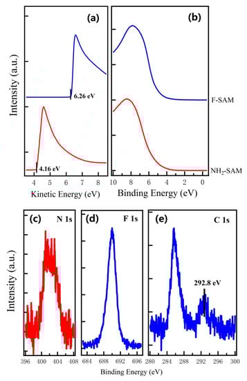 The UPS spectra for NH2-SAM and F-SAM on SiO2 substrates are shown in Figure 1. The WF of NH2-SAM and F-SAM are determined by the UPS spectra at the low kinetic energy region (Figure 1a); the WF of NH2-SAM is ~3.46 eV, and it is ~5.56 eV for F-SAM on SiO2 substrates, which agrees well with the previously reported values []. Figure 1c–e shows the N 1s spectrum for NH2-SAM, F 1s and C 1s spectra for F-SAM, respectively. For F-SAM on SiO2 substrates, two peaks can be identified in the C 1s region. The peak located at ~292.8 eV derives from carbon atoms in CF2 and CF3 species; the peak located at ~285.5 eV is attributed to carbon atoms from the alkyl chain of F-SAM. The XPS results shown in Figure 1c–e confirm the successful formation of NH2-SAM and F-SAM on SiO2 substrates in the present study.
