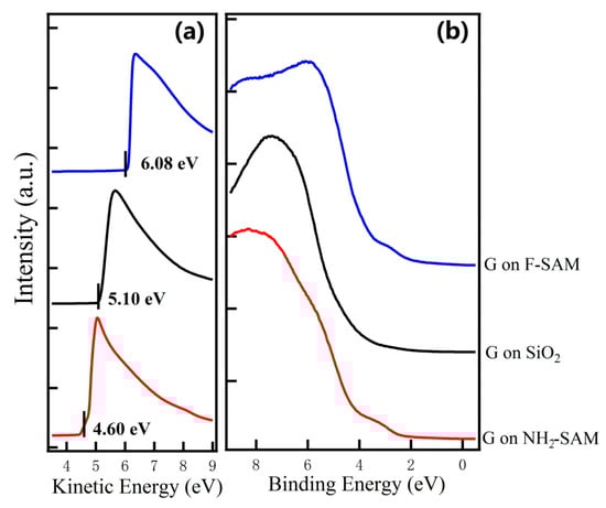The UPS spectra for graphene on NH2-SAM, SiO2, and F-SAM are shown in Figure 2. Without surface modification using SAMs, the WF of graphene is ~4.40 eV, showing good consistency with previous reports []. In the case of graphene on the NH2-SAM, the WF decreases to ~3.90 eV, which is evidenced by the shift of secondary electron cutoff toward the lower kinetic energy part. The decrease of the sample WF suggests that electrons transfer from NH2-SAM to graphene and thus it upward shifts its Fermi level. On the other hand, the sample WF change is in the opposite direction for graphene on F-SAM. The secondary electron cutoff shifts to the higher kinetic energy part (Figure 2a), indicating that the WF of graphene on F-SAM increases to ~5.38 eV. Because of the high electron accepting characteristics of the CF3 group, electrons transfer from graphene to F-SAM and thus lowers its Fermi level []. The manipulation of graphene Fermi level by SAM modification is further confirmed by Raman results (shown in Figure S2). Upward shifts for both G and 2D peak can be observed for graphene on F-SAM, whereas an upward shift for 2D and a downward shift for the G peak is found for graphene on NH2-SAM. These shifts of characteristic Raman peaks suggest that doping of graphene has been successfully realized using SAMs [].