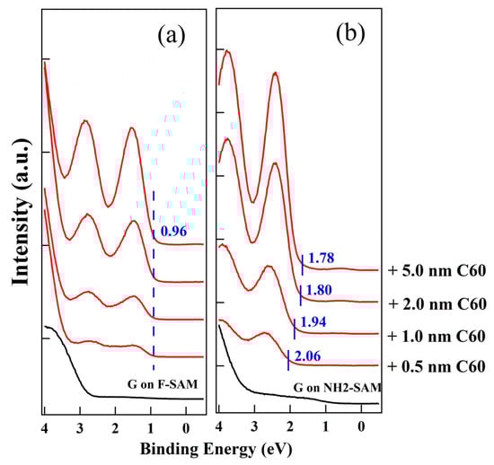 UPS spectra for the growth of C60 on (a) graphene/F-SAM and (b) graphene/NH2-SAM.