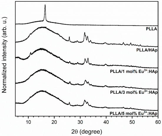 X-ray diffraction patterns of PLLA/x mol% Eu3+:HAp composites (where x = 0–5) obtained with the extrusion method.