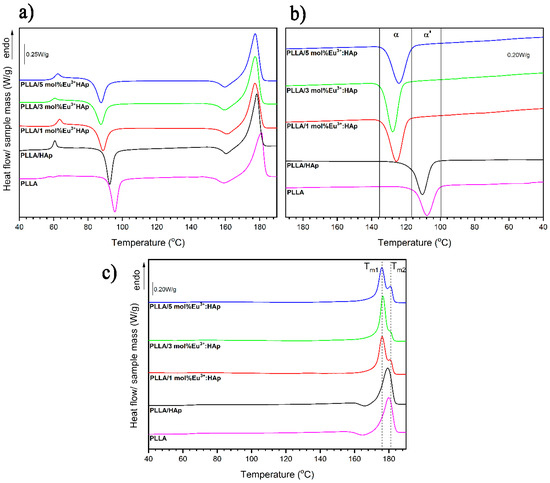 The influence of HAp particles and Eu3+ ions doping HAp on melt crystallization of PLLA can be analyzed based on the cooling DSC curves presented in Figure 5b and Table S2. For comparison of the cooling DSC curves, it is clearly visible that melt crystallization exotherms of PLLA in the analyzed samples have different temperature ranges. Neat PLLA and PLLA with unmodified HAp crystallize upon cooling at lower temperature ranges than PLLA with HAp modified with Eu3+. The Eu3+ ions have an influence on crystallization kinetics of PLLA. In the presence of Eu3+, PLLA crystallizes faster. Moreover, it is known that at lower temperatures, it crystallizes into alpha and alpha’ crystals whereas at higher temperatures, PLLA crystallizes in the alpha form [49]. It can be expected that the presence of Eu3+ has an influence on the crystalline form of PLLA that forms on melt crystallization. The verification of this assumption can be found in the second heating DSC curves (Figure 5c, Table S3).