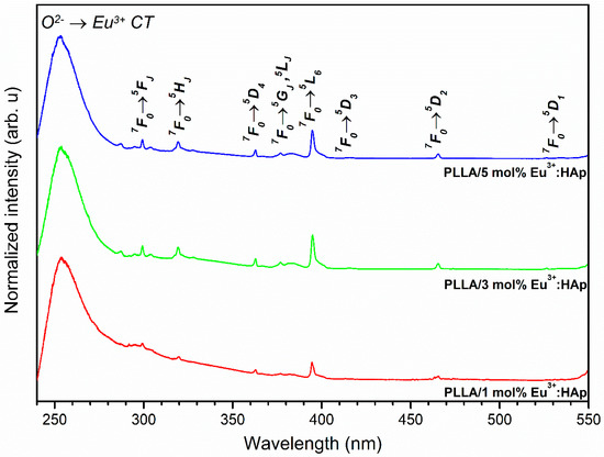 The excitation emission spectra of all the obtained materials were measured at room temperature, with a recording emission wavelength at 616 nm, which responds to the maximum of the most intense electric dipole transition (5D0 → 7F2). The spectra were corrected to the intensity of the excitation source and normalized to the most intense transition. All spectra contain characteristic sharp lines associated with the intraconfigurational 4f-4f transitions of the Eu3+ ions, as well as an intense and broad band related to the ligand-to-metal charge transfer (CT) O2− → Eu3+ transition located in the UV region. The excitation emission spectra presented in Figure S8 belong to Eu3+:HAp nanopowders and in Figure 6 belong to PLLA/Eu3+:HAp composites. The 4f orbitals of lanthanide ions are well isolated by the external 5s, 5p and 5d shells and well protected against the influence of the crystal field. Due to this feature, the barycenters of the f-f lanthanide electron transitions are weakly affected by the ligand field, and the position of these peaks remains almost independent of the host lattice structure [51,52]. The narrow peaks observed at 299.2 nm (33 422 cm−1) were ascribed to the 7F0 → 5F(4,3,2,1), 3P0 transitions, at 319.7 nm (31 279 cm−1) to 7F0 → 5H(6,5,4,7,3), at 363.4 nm (27 518 cm−1) to 7F0 → 5D4, 5L8 at 377.0 nm (26 525 cm−1) to 5L8, 7F0 → G2, 5L7, 5G3, at 394.4 nm (25 355 cm−1) to 7F0 → 5L6, at 416.2 nm (24 027 cm−1) to 7F0 → 5D3 at 465.9 nm (21 464 cm−1) to 7F0 → 5D2, as well as at 527.0 nm (18 975 cm−1) to 7F0 → 5D1. The allowed CT transition is strongly affected by electron-lattice coupling, and the peak position depends on the surrounding symmetry of the ion. In the case of PLLA/HAp composites, the CT maximum is located at 253.5 nm (39 448 cm−1). It is well known that the substitution of divalent Ca2+ by trivalent Eu3+ cations requires the charge compensation mechanism. The two mechanisms are well known for the apatite host lattice and have been described previously in [51,53,54].