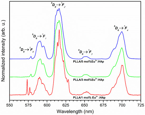The room temperature emission spectra of the entire nanopowders and nanocomposites were measured in the spectral range of 500–750 nm under 394.5 nm excitation as a function of optically active ions concentration. The emission spectra of Eu3+:HAp nanopowders are collected in Figure S9 and the emission spectra of PLLA/Eu3+:HAp composites are collected in Figure 7. The spectra were normalized to the 5D0 → 7F1 transition. As can be seen, the emission spectra of Eu3+ ions are composed of five bands related to the 5D0 → 7F0,1,2,3,4 transitions occurring respectively at ca. 573.5 nm (17 437 cm−1), 590.0 nm (16 949 cm−1), 616.2 nm (16 228 cm−1), 653.2 nm (15 309 cm−1) and 700.9 nm (14 267 cm−1). The most important transitions in the study of the structural and spectroscopic properties of Eu3+ ions are the 5D0 → 7F0,1,2 transitions.