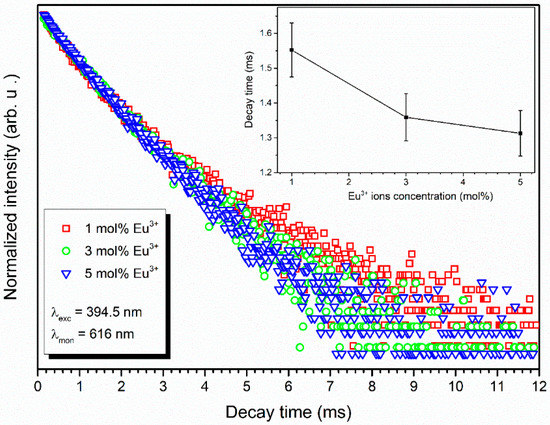 Emission kinetics of the Eu3+:Ca10(PO4)6(OH)2 nanoparticles embedded into poly(L-lactide) composites obtained by using the extrusion method. Insert: The decay time as a function of Eu3+ ions concentration.