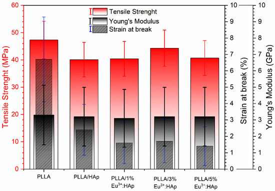 Tensile properties for PLLA/HAp composites: tensile strength (red left axis), strain at break (right axis) and Young’s modulus (right axis).