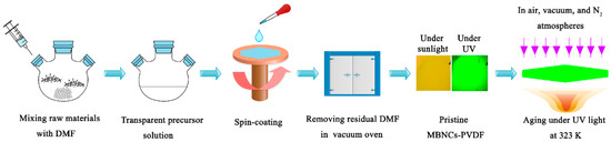 Aging under Co-stresses. The MBNCs-PVDF film is fixed at one end of a hollow cylinder, while at the other end a 368 nm UV LED, powered by small battery containing dry cells, functioning as the excitation source. The UV light emitted from the LED goes through the inner of the cylinder, yielding an irradiation intensity of 5.6 mW/cm2 at the surface of MBNCs-PVDF. The operations of accelerated aging are conducted in an oven (SLZK-40, Shanghai Shengli Test Instruments, Co., Ltd., Shanghai, China) at 323 K under air, vacuum, and N2 atmosphere, respectively. Every 2 h, the MBNCs-PVDF is taken out from the oven for PL measurement at room temperature using an integrating sphere and a spectrometer (Spectro 320, Instrument Systems, Munich, Germany).