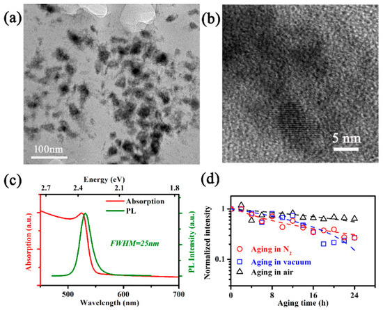 The NCs, with an average size of 15 nm (Figure 2a,b, verified by TEM), are distributed in the PVDF film, the resistances to oxygen and water of which facilitate research on the intrinsic stability of NCs [2]. At 300 K, the absorption spectrum (Figure 2c) exhibits an evident absorption peak at 2.37 eV (524 nm), while the PL peak at 2.34 eV (531 nm) has a full width at half maximum (FWHM) of 25 nm. The wavelength of PL peak of NCs in this work is shorter than those of bulk MAPbBr3 (545 nm) [24], whereas it is longer than that of MAPbBr3 quantum dots with a mean size smaller than 10 nm [25,26,27].