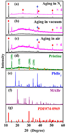 XRD patterns of MBNCs-PVDF: (a) After aging in N2; (b) after aging in vacuum; (c) after aging in an air atmosphere; and (d) pristine sample. For reference, (e) and (f) provide XRD patterns of PbBr2 and CH3NH3Br (MABr); and (g) provides a standard XRD pattern of NH4Pb2Br5 (PDF#74-0969). The standard patterns of MAPbBr3 (PDF#54-0752) are provided at the bottom of (d). Diamonds and stars indicate diffraction peaks of NH4Pb2Br5 and PbBr2, respectively. The temperature and 368-nm UV light irradiation density during aging are 323 K and 5.6 mW/cm2.