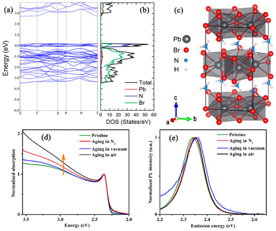 The electronic band-structure of NH4Pb2Br5 has been calculated, and the result reveals that NH4Pb2Br5 possesses a band gap of 2.5 eV (Figure 4a,b). The purpose of the calculation on electronic structures of NH4Pb2Br5 is to verify the existence of NH4Pb2Br5 in the aged MBNCs-PVDF from optical absorption spectra, since the optical absorption should exhibit major enhancement when the photon energy beyond the bandgap of NH4Pb2Br5, if there exists NH4Pb2Br5 in the aged MBNCs-PVDF. Compared with that of the pristine MBNCs-PVDF, the aged MBNCs-PVDF exhibits conspicuous enhancement on optical absorption when the photon energy is beyond 2.5 eV (Figure 4d). Therefore, in accordance with the result of XRD, the enhanced optical absorption in the region of energy beyond 2.5 eV also indicates the existence of NH4Pb2Br5 of the aged MBNCs-PVDF. As we cannot observe the PL emission from NH4Pb2Br5 (Figure 4e), its optical properties need further investigation in view of the debate on whether the inorganic counterpart CsPb2Br5 is PL inactive or PL active [30,31].