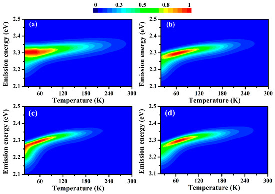 Pseudo-color maps of temperature-dependent PL spectra of MBNCs-PVDF: (a) Pristine; (b) after aging in N2; (c) after aging in vacuum; and (d) after aging in an air atmosphere. The aging temperature and 368 nm UV light illumination density of (b)–(d) are 323 K and 5.6 mW/cm2.