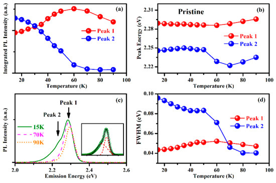 The comparison of two Gaussian fitted peaks from PL spectra of pristine MBNCs-PVDF: (a) Integrated PL intensity; (b) PL emission peak energy; and (d) FWHM of the fitted peaks obtained by two-peak Gaussian fitting. (c) PL spectra at 15 K, 70 K, and 90 K of pristine MBNCs-PVDF, illustrating the evolution of multipeak PL emission at low temperature, with the inset showing the two-peak Gaussian fitting result for the PL spectrum at 15 K.