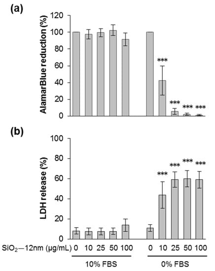 Cell viability decreased after incubation with silica NPs in the absence of fetal bovine serum (FBS). HCT116 wt cells were incubated with SiO2—12 nm NPs at the indicated concentration in the presence or absence of 10% FBS. After 24 h, cell viability was detected by the AlamarBlue assay (a). The values were normalized to the negative control (no particles were added, 100%). Lactate dehydrogenase (LDH) release is shown in (b). The values were normalized to the positive control (1% Triton X-100, 100%). The data represent the means of seven independent experiments ± SD performed with six replicates. *** p < 0.001 indicates significant differences in the response of cells treated with the same amount of NPs in the absence (0% FBS) or the presence of serum (10% FBS).