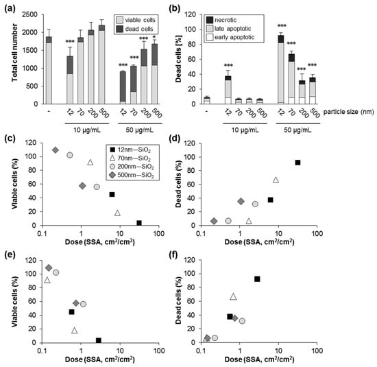 To address the impact of size on silica NP induced cell death under serum-free conditions, we studied colloidal silica spheres with nominal diameters of 70, 200, and 500 nm (Table 1). Administration of particles with increasing diameter but at the same mass concentration (10 and 50 µg/mL) revealed an inverse relationship of particle size and cytotoxicity, i.e., larger particles were less toxic compared to smaller particles (Figure 3a). Similarly to the effects observed for SiO2—12 nm NPs derived from flame synthesis (Figure 2), colloidal silica NPs also provoked apoptotic and necrotic cell death dependent on dose and size (Figure 3b, Figure S6). Silica NPs are surface active materials and interact with biological surfaces, i.e., cell membranes. The specific particle surface area (SSA, cm2 at a defined mass or volume) increases linearly with a reciprocal decrease in particle size. The dose–response related to the nominal concentration in the exposure media indicated increased toxicity of smaller versus larger silica NPs (Figure 3a,b). However, normalization of the dose response curves to the administered SSA showed a clear correlation of SSA and cytotoxicity (Figure 3c). As the deposited, i.e., effective, dose of particles is controlled by sedimentation and diffusion, which depend on particle size and effective density, we also calculated the delivered cellular dose [33,40]. While for the larger particles of 200 and 500 nm there was no major difference in the effective SSA dose, for the smaller nanoparticles (12 and 70 nm), the effective SSA (Figure 3e,f) was drastically reduced compared to the nominal dose (Figure 3c,d). As deposition of nanoparticles is mainly driven by diffusion, the relative fraction of administered NPs interacting with cells was lower compared to the larger particles, highlighting the importance of computational modeling of the relative in vitro dose for hazard ranking of differently sized materials. Indeed, several in vitro and in vivo studies have shown that cytotoxicity of insoluble NPs better correlates with the SSA dose than with the particle mass dose [24,41,42,43].