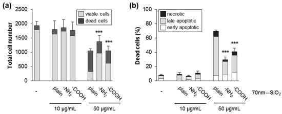 Surface modifications reduces cytotoxicity of silica NPs. HCT116 wt cells were exposed to SiO2—NPs (70 nm) with a plain, NH2—, or COOH—modified surface in the absence of FBS. After 24 h, the cells were processed and analyzed as described in Figure 2. (a) The total cell number divided into living and dead cells. (b) The percentage of dead cells relative to the total cell number divided into the different classes of cell death as indicated. Data show mean values of two independent experiments carried out with four replicates (n = 8). The error bars are SD values related to the total cell number (a) or the percentage of total dead cells (b), respectively. *** p < 0.001 indicates significant differences in the number of viable cells (a) and total dead cells (b) after administration of modified NPs compared to corresponding concentrations of plain particles.