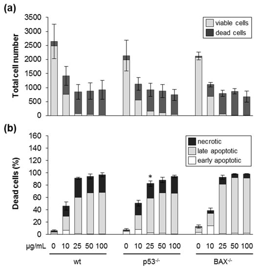 Silica NPs induce cell death independent of p53 and BAX. HCT116 wild-type (wt), p53 knock-out (−/−) and BAX knock-out (−/−) cells were incubated with SiO2—12 nm NPs as indicated in the absence of FBS. After 24 h, the cells were processed and analyzed as described in Figure 2. (a) The total cell number divided into living and dead cells. (b) The percentage of dead cells relative to the total cell number divided into the different classes of cell death as indicated. Data show mean values of five–six independent experiments with wt and p53−/− cells. For BAX−/− cells, one representative experiment out of two is shown. All experiments were carried out with three–four replicates. The error bars are SD values related to the total cell number (a) or the percentage of total dead cells (b), respectively. Note that there was no major difference in the response of p53−/− or BAX−/− compared to wild-type cells. * p < 0.05.