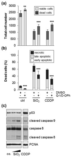 Silica NPs induce cell death dependent on caspases. HCT116 wt cells were incubated with 10 µg/mL SiO2—12 nm NPs or with 50 µM of the positive control compound cisplatin (CDDP) in medium without FBS. Samples were co-treated as indicated either with the pan-caspase inhibitor Q-VD-OPh (10 µM) dissolved in DMSO (0.5%) or simply the solvent (DMSO, 0.5%). After 24 h, the cells were processed and analyzed as described in Figure 2. (a) The total cell number divided into living and dead cells; (b) the percentage of dead cells relative to the total cell number divided into the different classes of cell death as indicated. Data show mean values of two independent experiments carried out with four replicates (n = 8). The error bars are SD values related to the total cell number (a) or the percentage of total dead cells (b), respectively. *** p < 0.001 indicates significant differences in the response of cells treated with or without the pan-caspase inhibitor. (c) Activation, i.e., cleavage of caspase 8 and 9 was analyzed by western blotting after treatment with 0 (co.), 5 and 10 µg/mL SiO2—12 nm NPs or with 50 µM CDDP in the absence of serum for 22 h. PCNA was used as a loading control. The results are representative of two independent experiments.