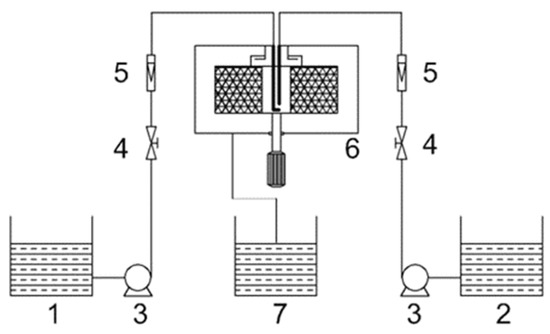 Experimental setup: 1, 2: liquid storage tank; 3: pump; 4: valve; 5: rotormeter; 6: impinging steam-rotating packed bed (IS-RPB); 7: collection tank.