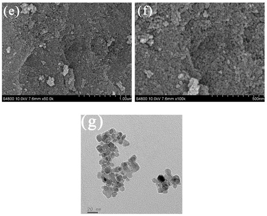 SEM images of nano-TiO2 at rotating speeds of the packing of 400 rpm (a,b), 800 rpm (c,d), and 1200 rpm (e,f). TEM images of nano-TiO2 at a rotating speed of the packing of 800 rpm (g).