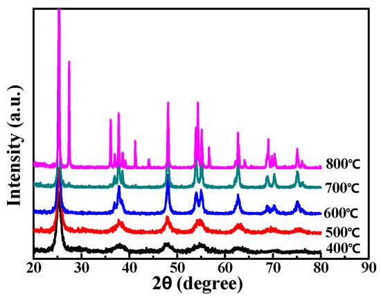 The XRD spectra of nano-TiO2 synthesized at different temperatures are shown in Figure 4. In the XRD spectra, the characteristic peak of the anatase phase appears in TiO2 after calcination at 400 °C, but the peak pattern is weak, indicating that the crystal is not complete and only partially transformed into the anatase phase. TiO2 annealed at 500 °C shows a complete anatase diffraction peak, and the main peaks appear at the angles of 2θ at 25.18°, 37.90°, 48.09°, 53.96°, 62.71°, 69.12°, 70.30° and 75.00°, respectively, corresponding to the crystal planes of the anatase phase being (101), (004), (200), (105), (204), (220), (215), respectively. The results show that the amorphous TiO2 is completely transformed from amorphous to anatase (JCPDS No. 021/1272) [34,35]. After being calcinated at 700 °C and 800 °C, the rutile diffraction peak (2θ at 27.34° and other positions) appears. The peak pattern becomes particularly sharp after calcination at 600 °C, 700 °C and 800 °C, reflecting the increase of grain size after calcination at higher temperatures. The grain size is calculated by the Scherrer formula.