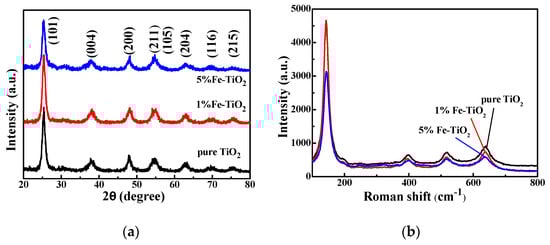 (a) XRD spectra of pure TiO2 and Fe-TiO2; (b) Raman spectra of pure TiO2 and Fe-TiO2.