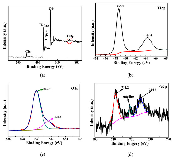 XRD and Raman analysis did not find the specific existence state of iron, but both showed evidence of the existence of iron. Therefore, the synthesized Fe-TiO2 was analyzed by XPS to determine the specific existence of iron. Figure 6 shows the full XPS spectrum of 5%Fe-TiO2 and the high-resolution spectra of Ti2p, O1s and Fe2p. All electron binding energies were calibrated according to C1s (284.6 eV) of contaminated carbon. The full spectrum of 5.0%Fe-TiO2 is shown in Figure 6a; the main elements are Ti and O, and there are relatively few Fe elements in the sample, meaning that the detected signal of the Fe element is relatively weak. The peaks at 458.7 eV and 464.5 eV correspond to the Ti2p characteristic peaks of Ti2p3/2 and Ti2p1/2 in Figure 6b. The peaks at 529.9 eV and 531.5 eV correspond to the characteristic peaks of O1s in Figure 6c. Figure 6d shows less obvious Fe2p characteristic peaks than Figure 6a, which are the main characteristic peaks of Fe2p3/2 and Fe2p1/2 corresponding to 711.5 eV and 724.6 eV and the satellite peaks of 718.9 eV. This is consistent with the detection of Fe3+ by Yamashita et al. [42], which proves that iron exists in the positive trivalent form. No single iron phase is found in Raman spectra and XRD, leading us to speculate that iron could be doped into the lattice.