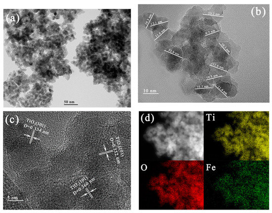 TEM and HRTEM images of 5%Fe-TiO2 nanoparticles were measured to study their morphology and microstructure (Figure 7a–c). From Figure 7a,b, it can be seen that the 5% Fe-TiO2 particles remain the same spherical particles as the prepared pure TiO2, with a particle size of 11.3 ± 1.9 nm. The lattice stripes of 5%Fe-TiO2 particles are shown in Figure 7c, and the lattice stripe spacing of 0.352 to 0.360 nm corresponds to the (101) crystal plane of the TiO2 anatase phase. EDX mapping characterization was carried out to determine the doping status of Fe3+ in TiO2. From Figure 7d, it can be seen that Fe, Ti and O elements are uniformly distributed in the whole visual field, indicating that Fe has formed uniform doping in TiO2 and also proving that the uniform doping of Fe elements could be realized in IS-RPB.