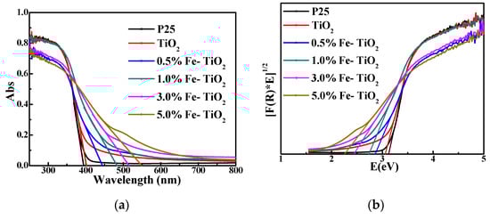 The photoresponse of prepared samples was analyzed by UV-Vis DRS and compared with commercial P25. The results are shown in Figure 8a. The curves of all the samples have a similar shape, indicating that iron did not significantly change TiO2. The difference of the curves lies in the difference of the downward trend and amplitude at 350 to 600 nm. The intersection of the tangent with transverse coordinates at the most obvious downward trend of the curve represents the limit of light absorption. All samples had strong light absorption below 400 nm, but P25 and pure TiO2 had almost no absorption at 400 to 800 nm. On the contrary, Fe-TiO2 shows different degrees of absorption to visible light, and the maximum optical absorption wavelength increases with the increase of Fe3+ content. This is probably due to the fact that Fe3+ precipitates uniformly in TiO2 during precipitation synthesis, and after calcination at high temperature, Fe3+ enters into the TiO2 lattice and uniformly replaces part of Ti4+, resulting in the absorption of visible light. The calculation of the band gap energy of samples by the Kubelka–Munk formula is as follows: