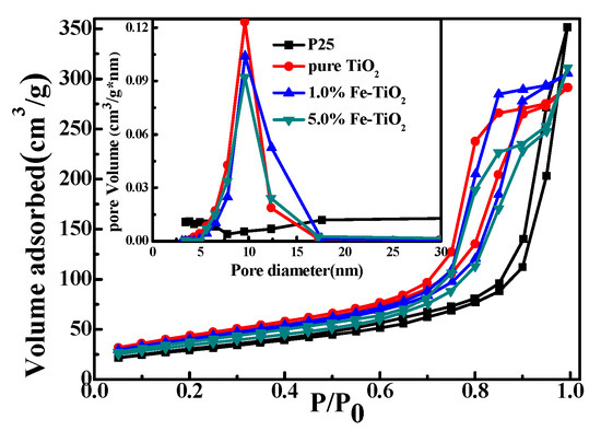 In order to analyze the surface area, total pore volume and average pore diameter of photocatalysts, N2 adsorption–desorption isotherms were measured, and the corresponding data are shown in Table 2. In Figure 9, the adsorption trend and desorption trend of pure TiO2, 1.0%Fe-TiO2 and 5.0%Fe-TiO2 prepared by IS-RPB show sharp changes at P/P0 between 0.6 and 0.9, indicating that isotherms are the IV-type and that the pore is mesoporous. The hysteretic loop formed by the curve is obviously H2-type, indicating that the catalyst has an ink-bottle-type pore structure [45]. P25 corresponds to the non-porous II-type isotherm. In the pore size distribution diagram and Table 2, the three catalysts prepared by IS-RPB show similar small and narrow pore size distributions and a similar total pore volume, while P25 has a wide pore size distribution and a pore size of 30.56 nm, which is the reason the specific surface area of the three catalysts is larger than P25.