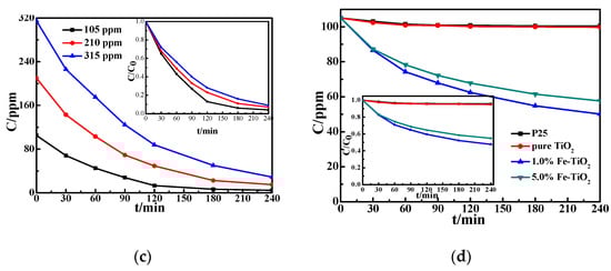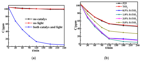 A control experiment was carried out to explore the adsorption of toluene by the catalyst and the direct decomposition of toluene by high-energy UV light; i.e., toluene was degraded by only the catalyst, only light, and both the catalyst and light (1.0%Fe-TiO2 was used as the catalyst). The result is shown in Figure 10a. Using only the catalyst, there is a slight decrease of the toluene concentration at the initial time, which was caused by the adsorption of the catalyst on toluene, and the concentration no longer decreases when the adsorption reaches equilibrium. Using only light, the toluene concentration remained weakly decreasing as the degradation progressed, because the photon energy at 254 nm was larger and a little toluene was decomposed. Using both the catalyst and light, toluene was greatly degraded. This is because TiO2 is excited by UV light, forming electrons and holes, and a series of reactions produce oxidative species such as ·OH, which can effectively decompose toluene.