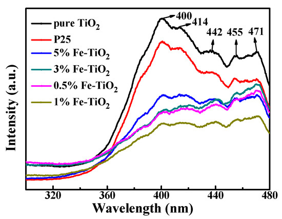 The degradation experiment of toluene showed that the degradation efficiency of Fe-TiO2 was higher than that of TiO2 and P25. To explain this phenomenon, photoluminescence spectra (PL) were employed under the excitation of light of the same wavelength (254 nm) as the degradation experiment (Figure 11). The main peak positions of all catalysts were the same, distributed at 400, 414, 442, 455 and 471 nm, and no new emission peaks appeared at the PL of Fe-TiO2. The peak at 400 nm corresponds to the recombination of electrons and holes of TiO2; the other peaks were probably produced by oxygen vacancies or band edge free excitons [46,47]. The peak intensity of Fe-TiO2 at 400 nm is obviously weakened, which shows that the doping of iron has an obvious inhibitory effect on the recombination of electrons and holes. The weakening trend of peak intensity is completely consistent with the degradation at different catalysts, which shows that the doping of Fe3+ has an optimum concentration and that 1% Fe may be the optimal doping concentration. The doping level was insufficient at 0.5%Fe-TiO2, and Fe3+ may become the recombination center of electrons and holes, leading to reduced catalytic performance, because of the high iron content at 5%Fe-TiO2.