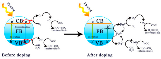 Figure 12 shows a possible mechanism of photocatalytic enhancement. It has been shown that the iron in Fe-TiO2 exists in the form of Fe3+ and maintains a highly uniform distribution, while the radius of Fe3+ is close to that of Ti4+, which is conducive to the formation of uniform substitution doping into the lattice [22], resulting in a doping level with low width. The generation of this energy level leads to the red shift of light absorption. At the same time, Fe3+ exhibits a transformation of Fe3+→Fe4+ and Fe3+→Fe2+, which can capture and transfer photogenerated electrons and holes, respectively [22,36,46]. The recombination of them is prevented, which improves the quantum efficiency, which is consistent with the results shown by PL spectra.