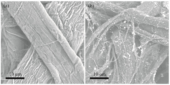 Scanning electron microscopy (SEM) images of the (a) iron/palladium (Fe/Pd)-free and (b) Fe/Pd nanoparticle (NP)-assembled filter paper.