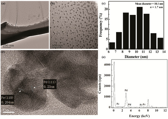 TEM was further conducted for the observation of Fe/Pd NPs distribution onto filter paper from the cross-section (Figure 2). It can be seen that individual Fe/Pd NPs with a quasi-spherical shape are densely and uniformly distributed along the cross-section of the filter paper (Figure 2a,b). The mean diameter of the Fe/Pd NPs was measured to be 10.1 ± 1.7 nm (Figure 2c), indicating that the filter paper employed in this study is a good substrate for the growth and assembly of bimetallic Fe/Pd NPs. High-resolution TEM image reveals the lattice structure of the NPs, and the d spacing was calculated to be 0.204 nm and 0.23 nm, corresponding to the [110] plane of α-Fe0 and the [111] plane of the face-centered cubic crystal structure of Pd, respectively [24,25]. Furthermore, energy-dispersive spectrum (EDS) shows clearly the signals of Pd and Fe elements, confirming the bimetallic nature of the Fe/Pd NP-assembled filter paper.
