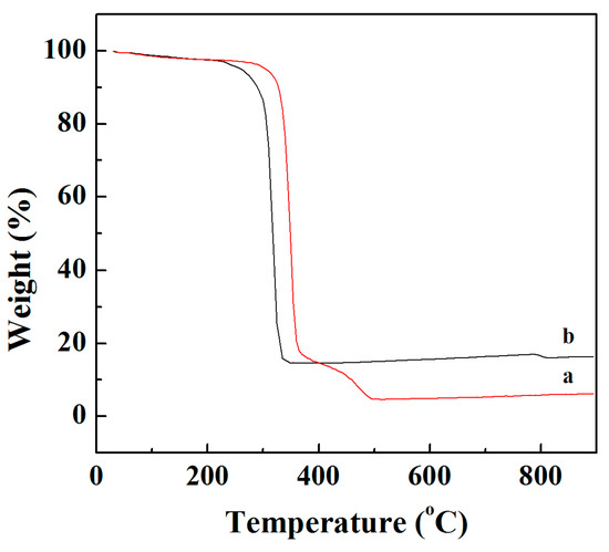 Thermogravimetric analysis (TGA) curves of the (Curve a) iron/palladium (Fe/Pd)-free and (Curve b) Fe/Pd nanoparticle (NP)-assembled filter paper.
