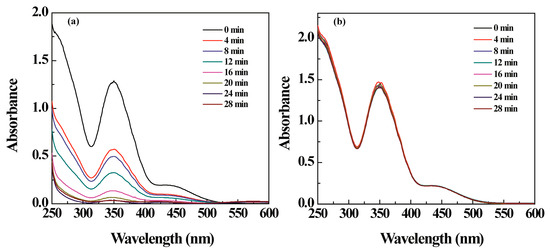UV-vis spectra of the reaction solution treated with (a) iron/palladium nanoparticle (Fe/Pd NP)-assembled filter paper and (b) Fe/Pd-free filter paper at different time intervals.
