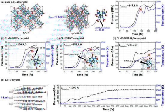Shock dynamics of the (a) ε-CL-20 crystal, (b) CL-20/HMX cocrystal, (c) CL-20/TNT cocrystal, (d) CL-20/NMP/H2O cocrystal and (e) TATB crystal. In each panel, the temperature and pressure are shown as a function of time. The molecular conformations at the beginning of each decomposition reaction are also plotted.