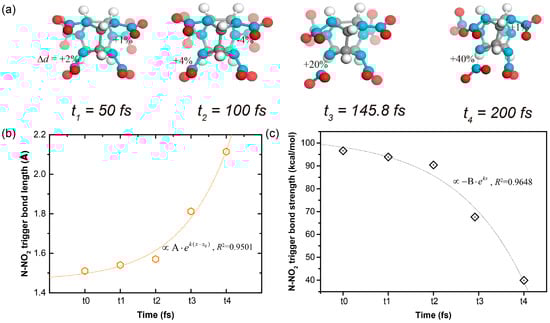 Take the shocked ε-CL-20 crystal as an example. The N–NO2 bonds with the exo-spatial orientation with respect to the five-membered imidazolidine ring were the trigger bonds. During the shock process, the molecular conformations at different times are shown in Figure 3a. Both the increase of the trigger bond length and the decrease of the trigger bond strength went in an exponential manner, as shown in Figure 3b,c. When the stretching of the chemical bond reached the cutoff percentage relative to the equilibrium state, we defined it as broken. Therefore, the first breaking of the trigger bond of the shocked ε-CL-20 crystal occurred at t3 = 145.8 fs.